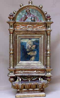madera, particularmente la delgadez de sus movidos paños y la fragilidad de las guedejas de sus cabellos. Pero, sin duda, donde la pieza llega a su mayor delirio barroco es en el revoloteo bajo de ángeles desnudos y en las expresiones de sus rostros. En cuanto a la escultura de San José nos atrae el dinamismo cerrado de su composición y la intensa expresión de los personajes, contrastando la mirada implorante al cielo del Patriarca y el dulce y profundo sueño del Niño Jesús. En ambas tallas destacan la delicadeza y la calidad de sus policromías, actualmente recuperadas en todo su esplendor tras de su reciente restauración.